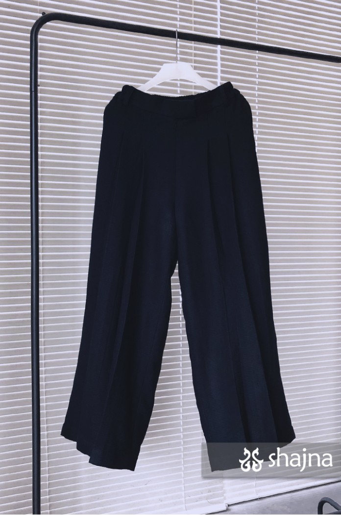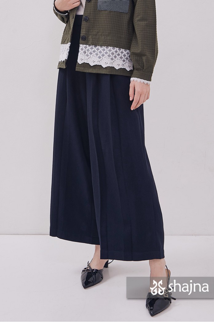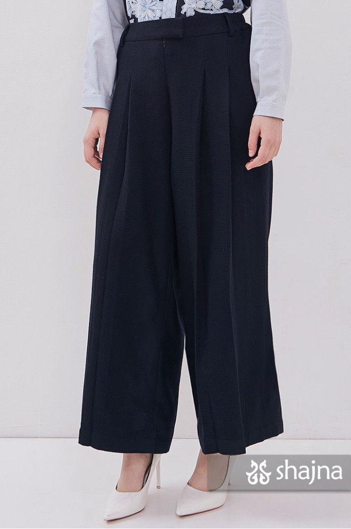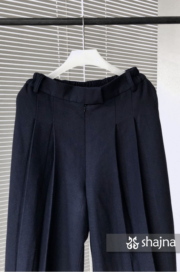 Double-layered pleated wide trousers with deep side pockets, elastic waist band on the back, belt loops, and zipper on the front opening. Full lining (furing) inside. Navy colored.