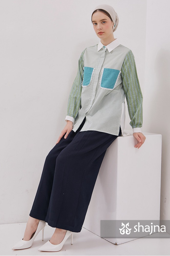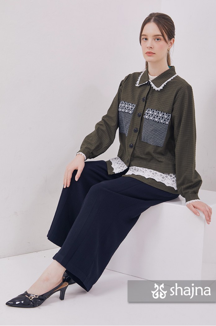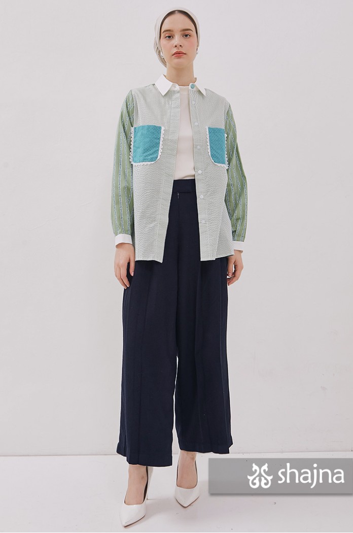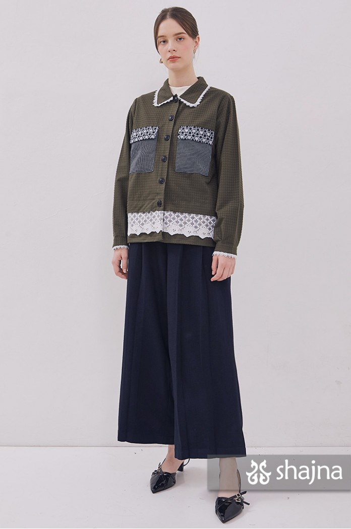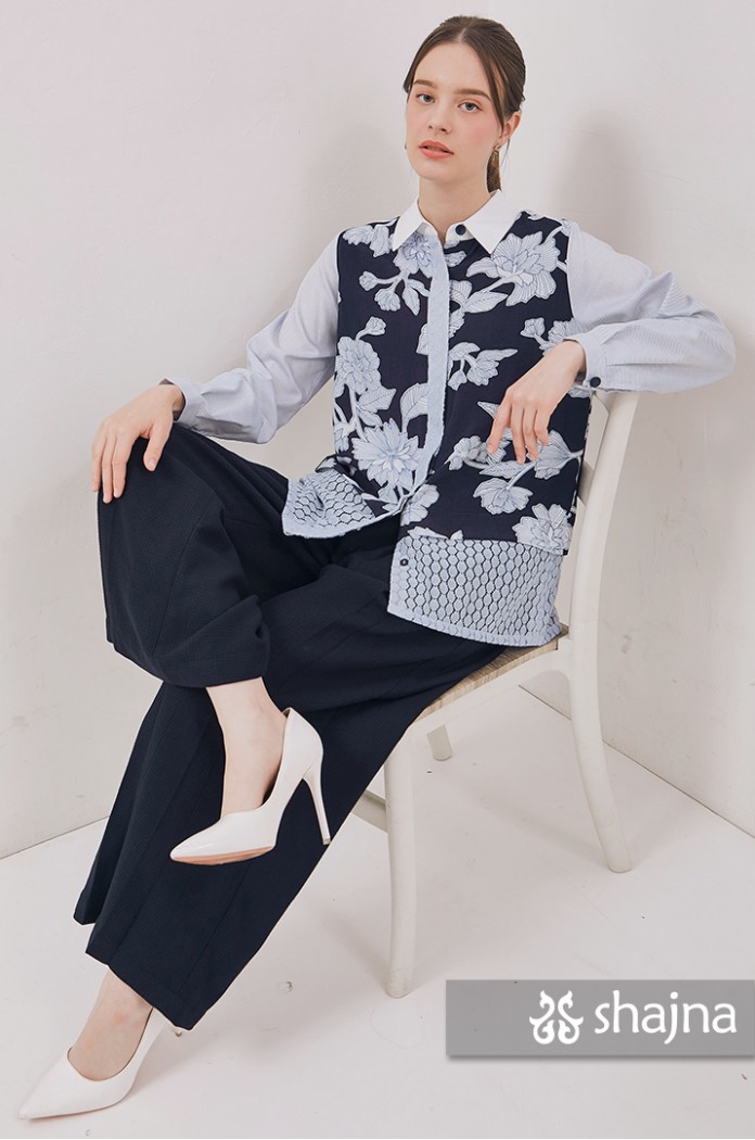 Double-layered pleated wide trousers with deep side pockets, elastic waist band on the back, belt loops, and zipper on the front opening. Full lining (furing) inside. Navy colored.