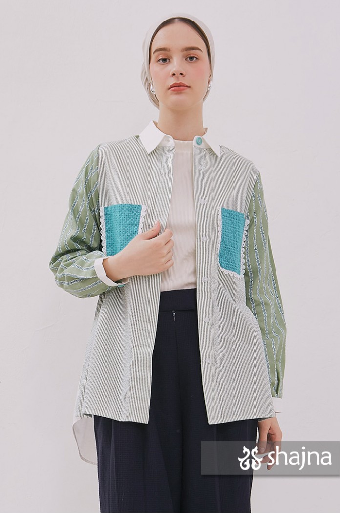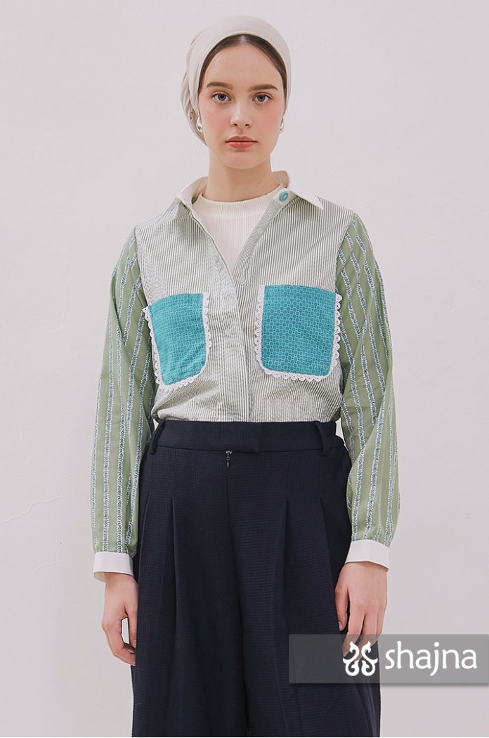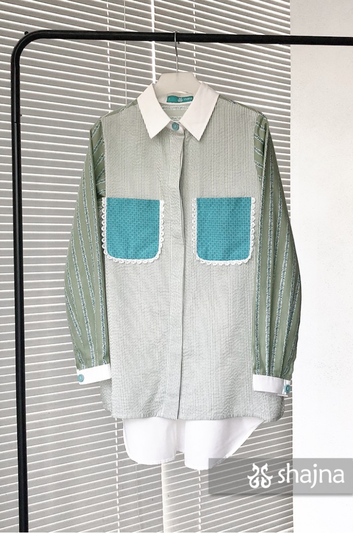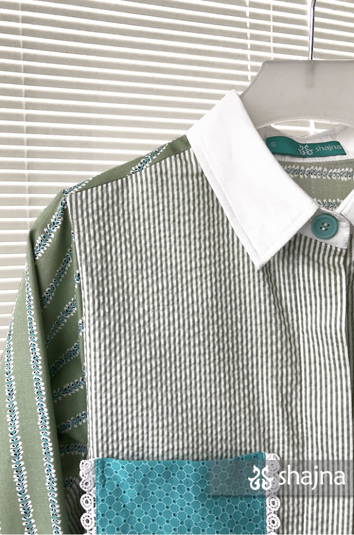 Mixed pattern shirt with front pockets, unique back composition, and front opening using hidden buttons.