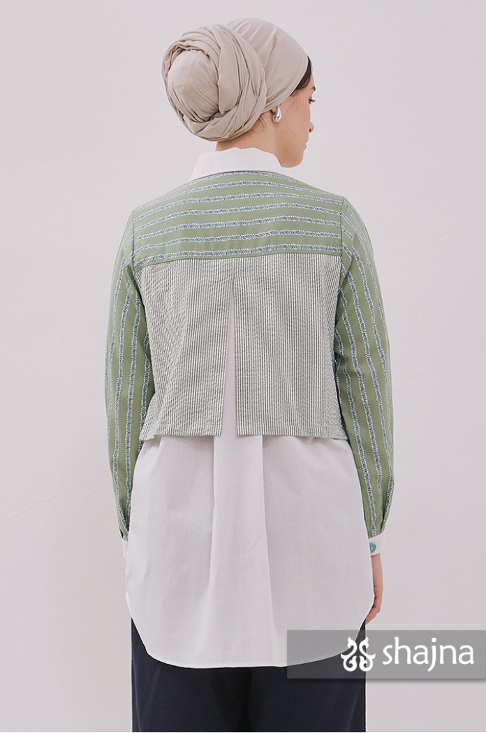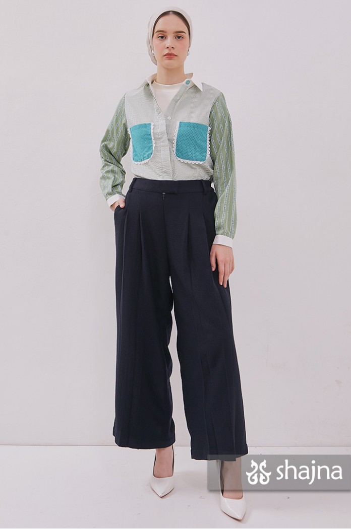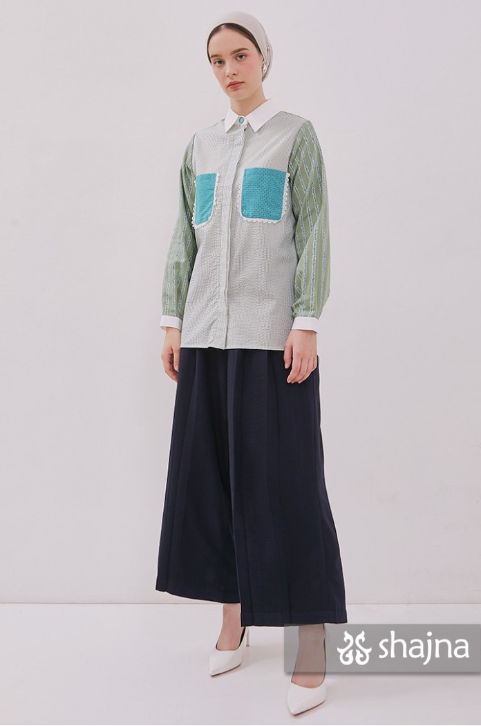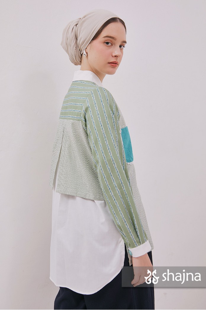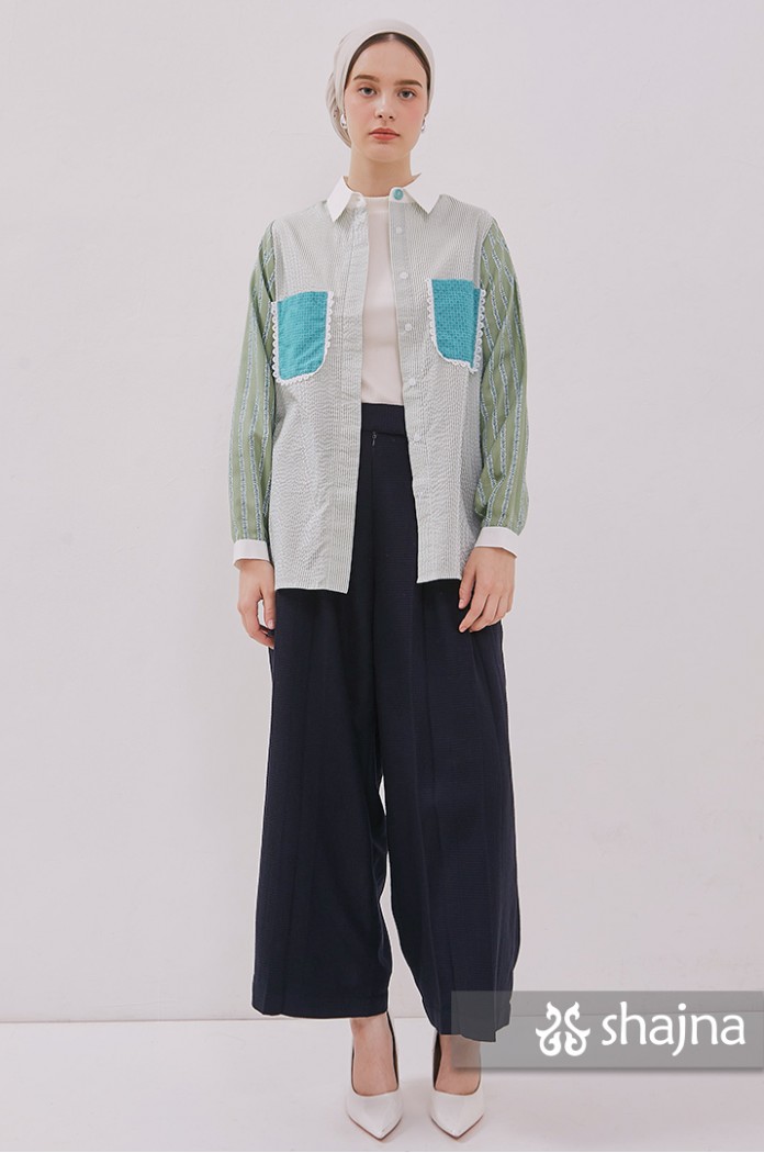 Mixed pattern shirt with front pockets, unique back composition, and front opening using hidden buttons.