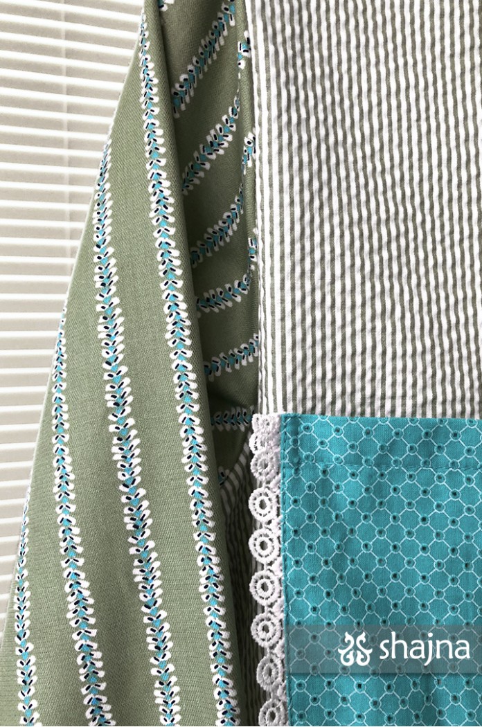 Fabric: Cotton, crinkled striped cotton, printed cotton, lace.