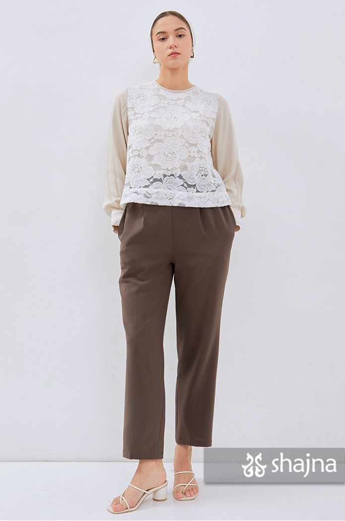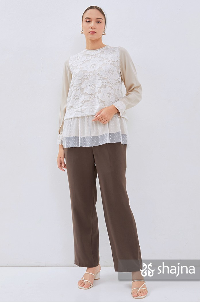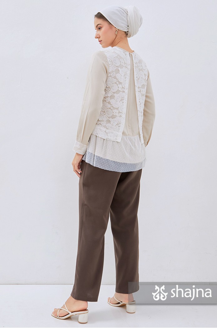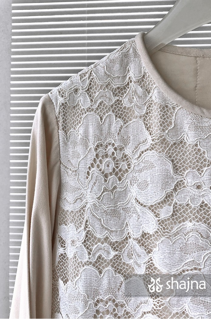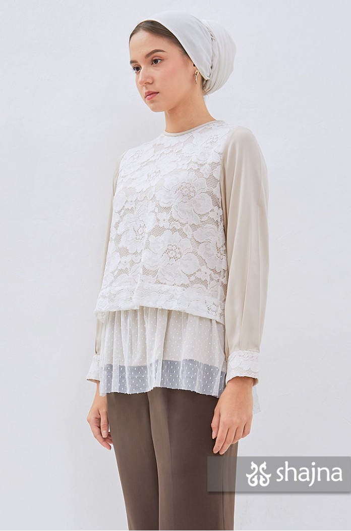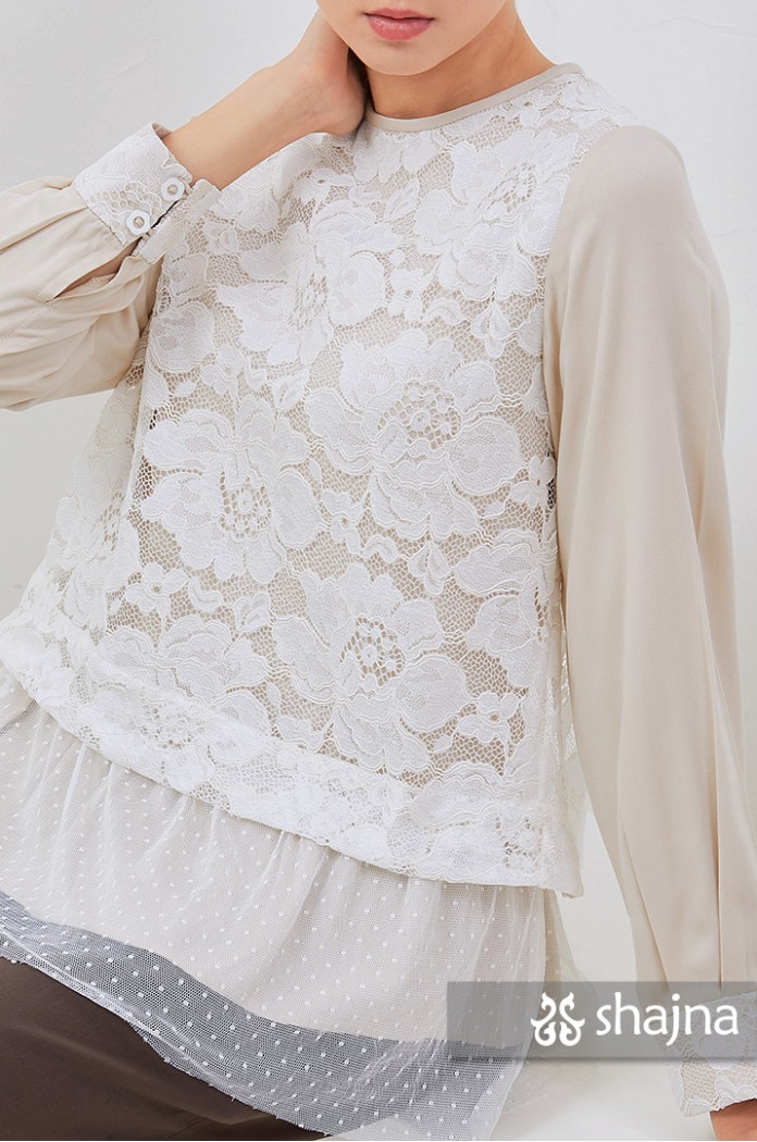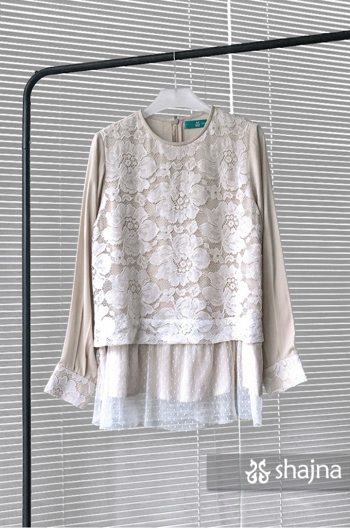 Fully double layered lace top with unique back flaps, adjustable cuffs using buttons, and full lining on body. Stacked on lace, inner layer, and polkadot tulle combination. Back opening using a hidden zipper.