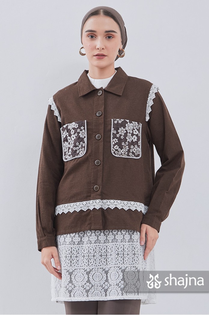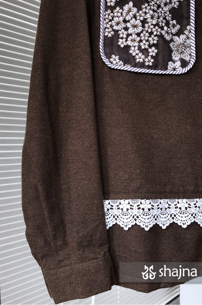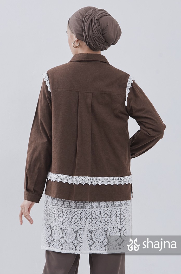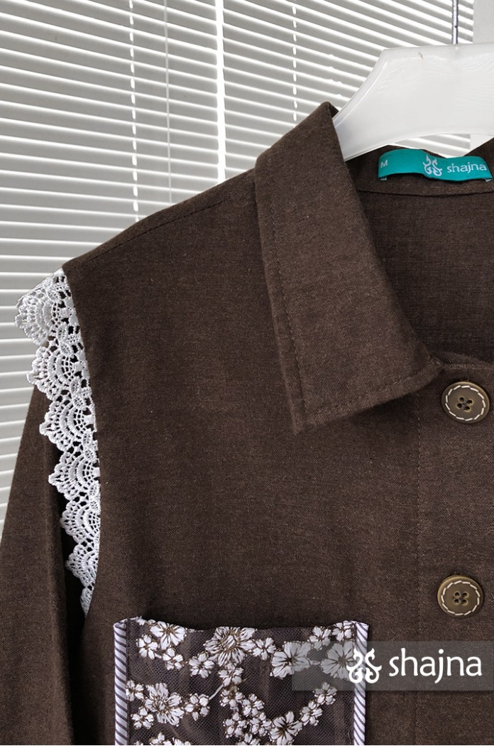 Kemeja flannel dengan kombinasi lace, dapat dipakai juga sebagai outerwear. Disertai saku bordir di depan dan lipit di punggung. Berwarna coklat tua.