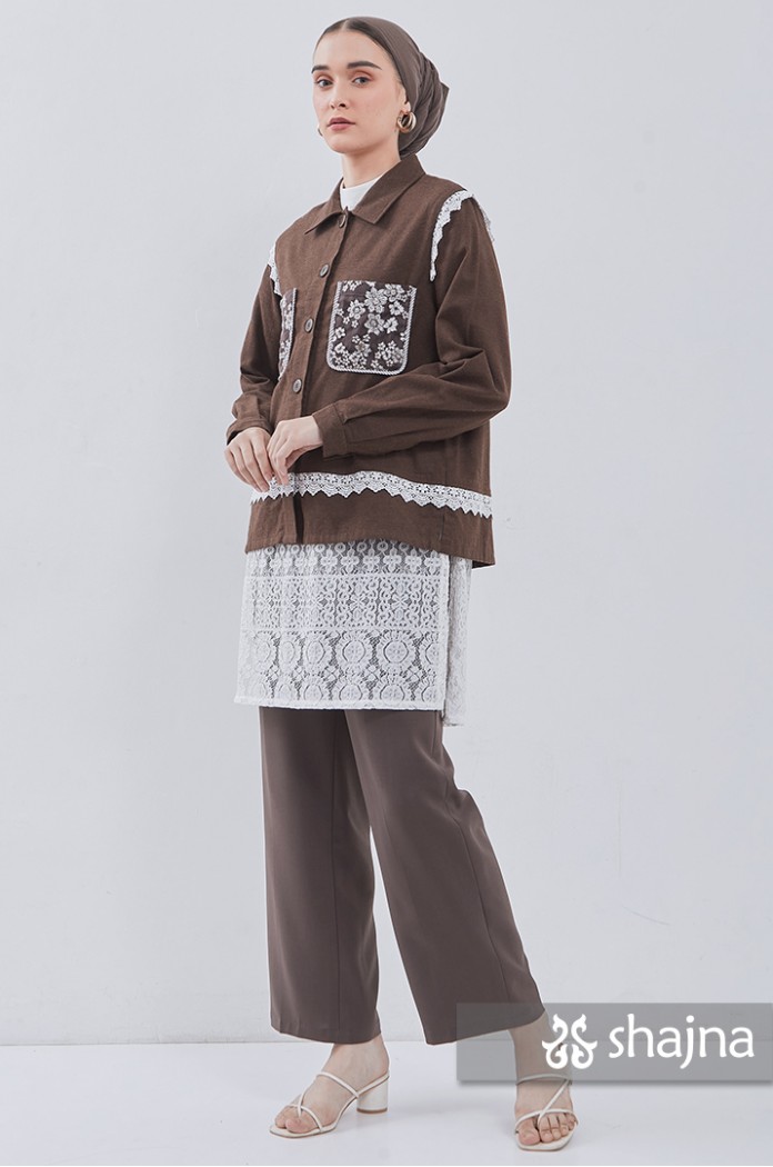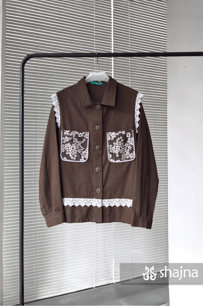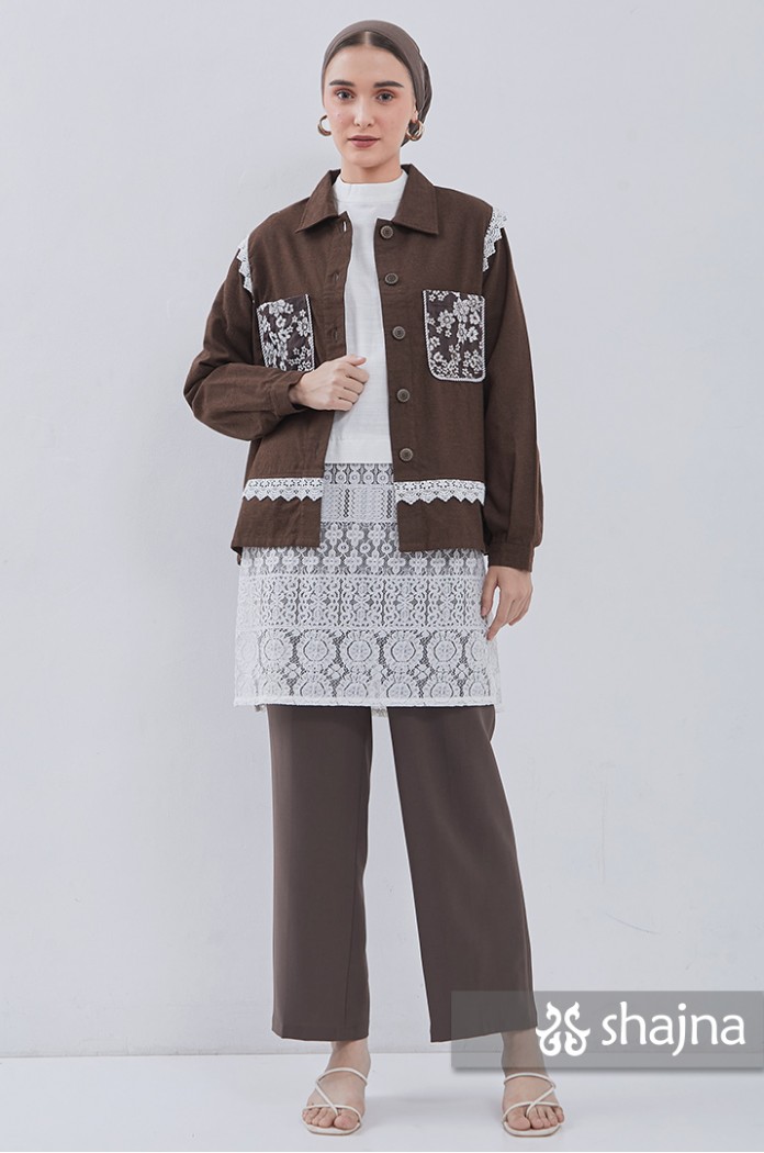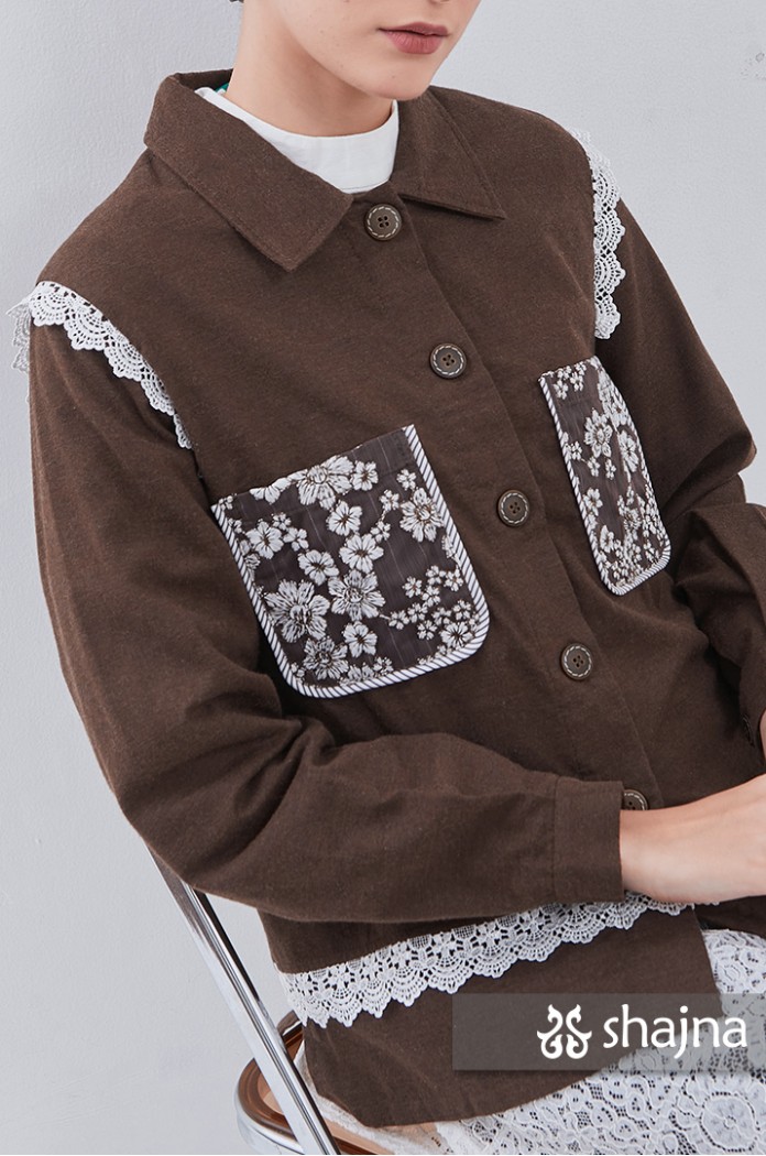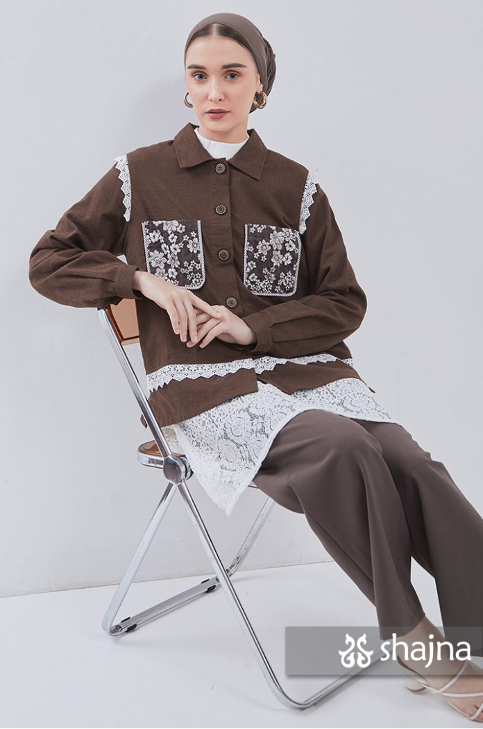 Kemeja flannel dengan kombinasi lace, dapat dipakai juga sebagai outerwear. Disertai saku bordir di depan dan lipit di punggung. Berwarna coklat tua.