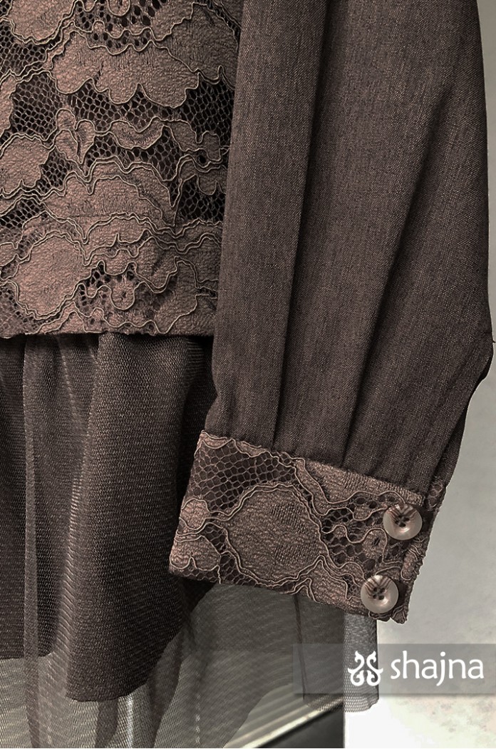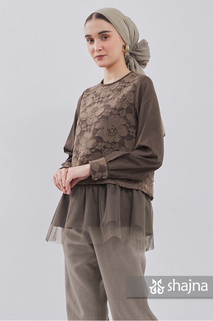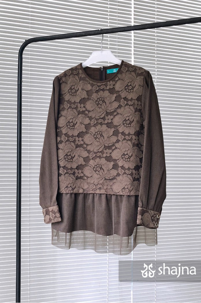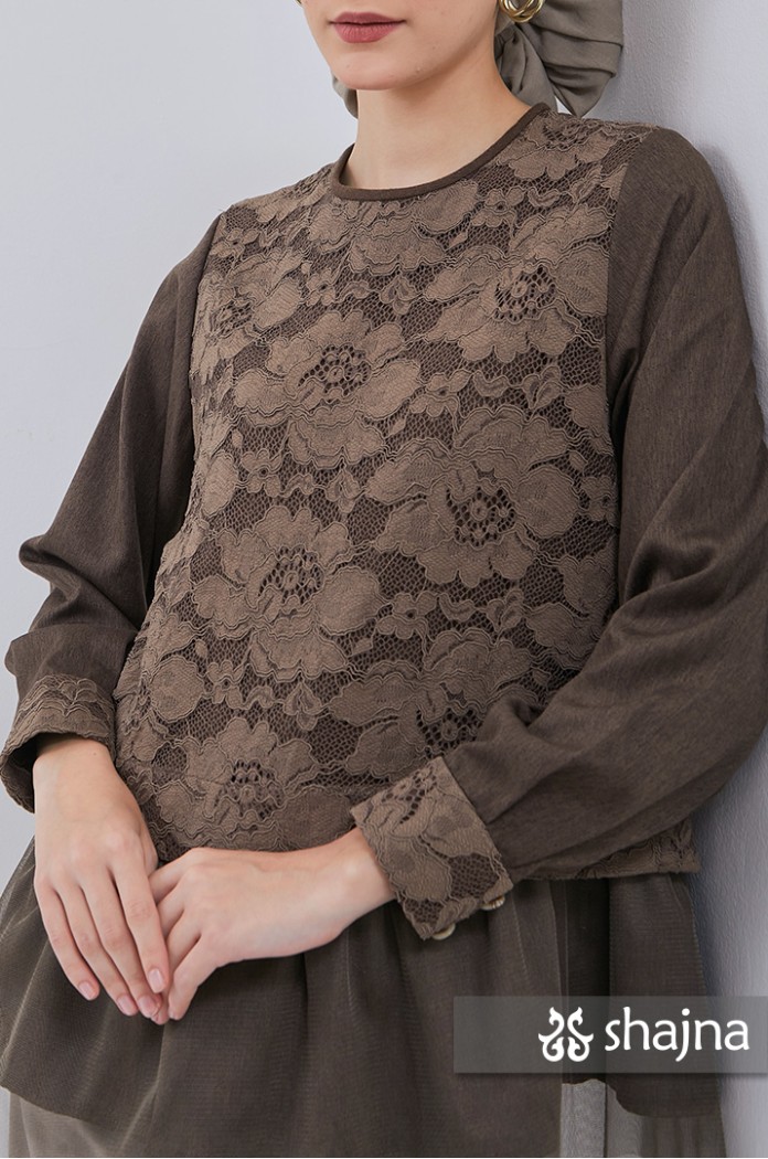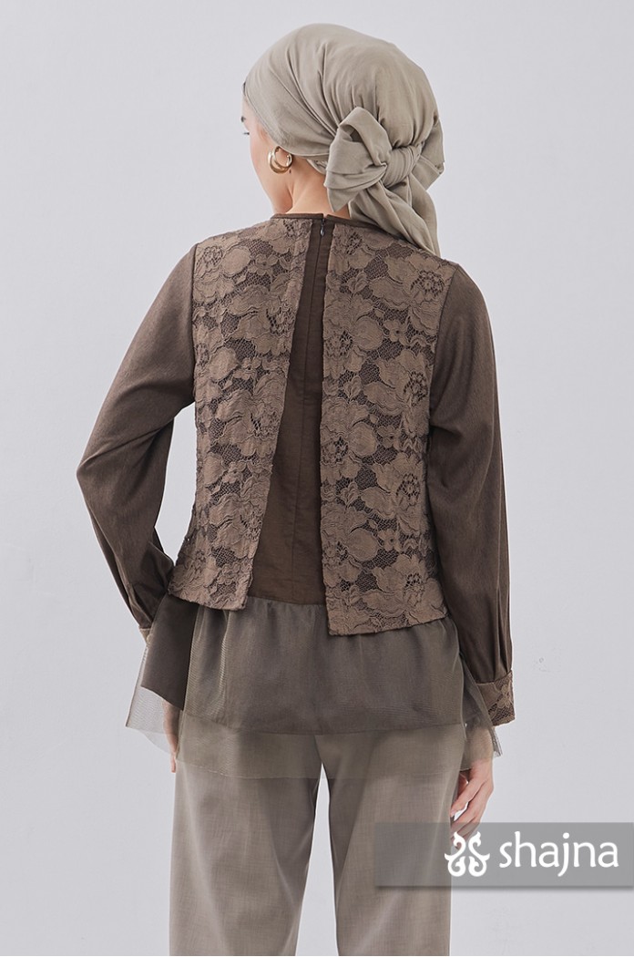 Atasan lace berlayer ganda penuh dengan flap belakang unik, ujung tangan yang dapat dibuka, dan full furing pada badan. Bergaya tumpuk dengan kombinasi lace, inner layer, dan tulle. Bukaan di belakang menggunakan resleting tersembunyi.