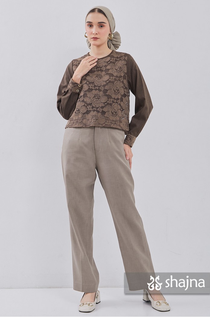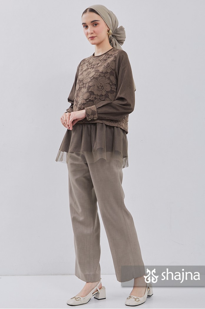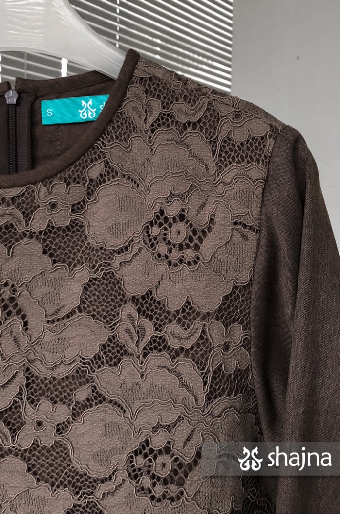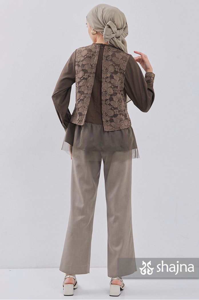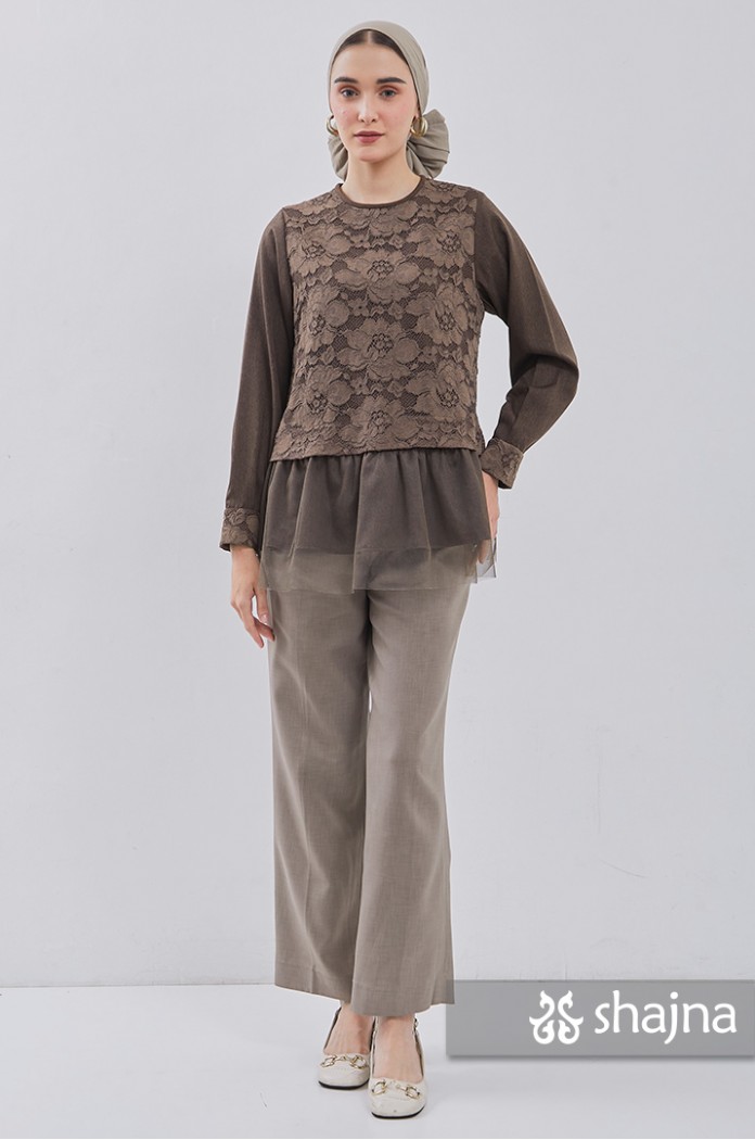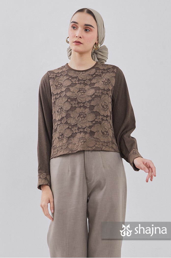 Atasan lace berlayer ganda penuh dengan flap belakang unik, ujung tangan yang dapat dibuka, dan full furing pada badan. Bergaya tumpuk dengan kombinasi lace, inner layer, dan tulle. Bukaan di belakang menggunakan resleting tersembunyi.