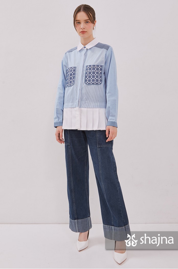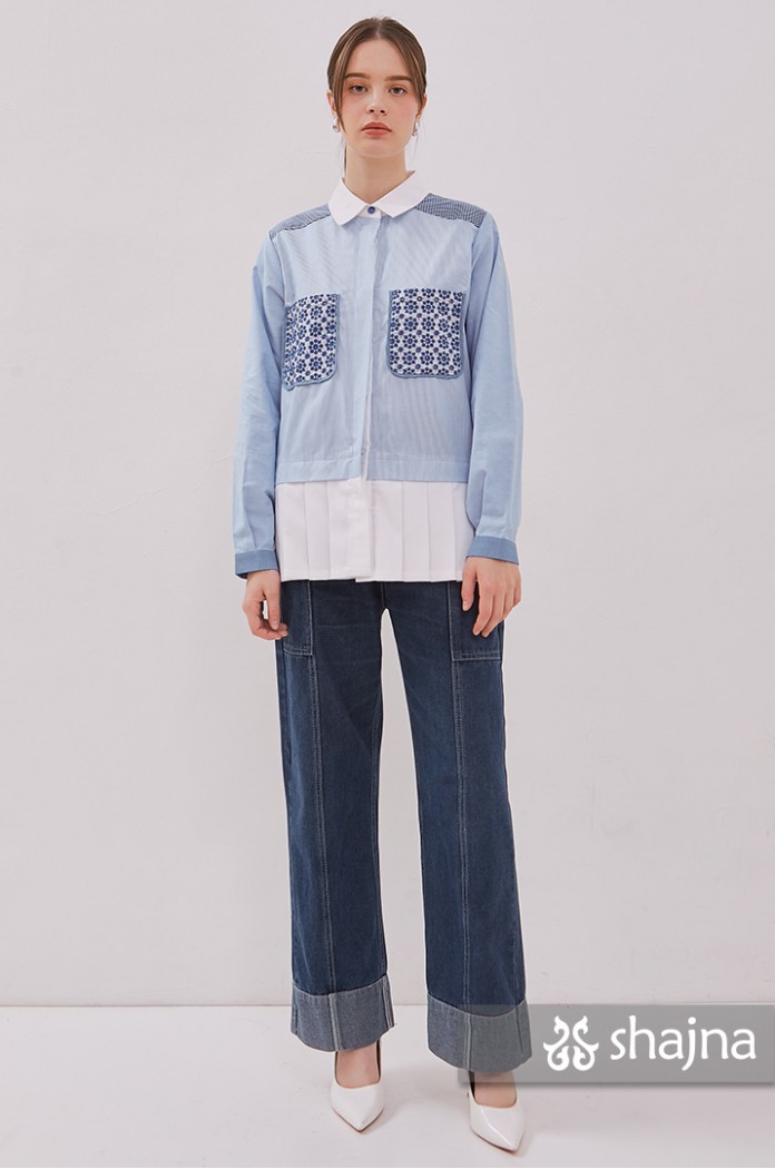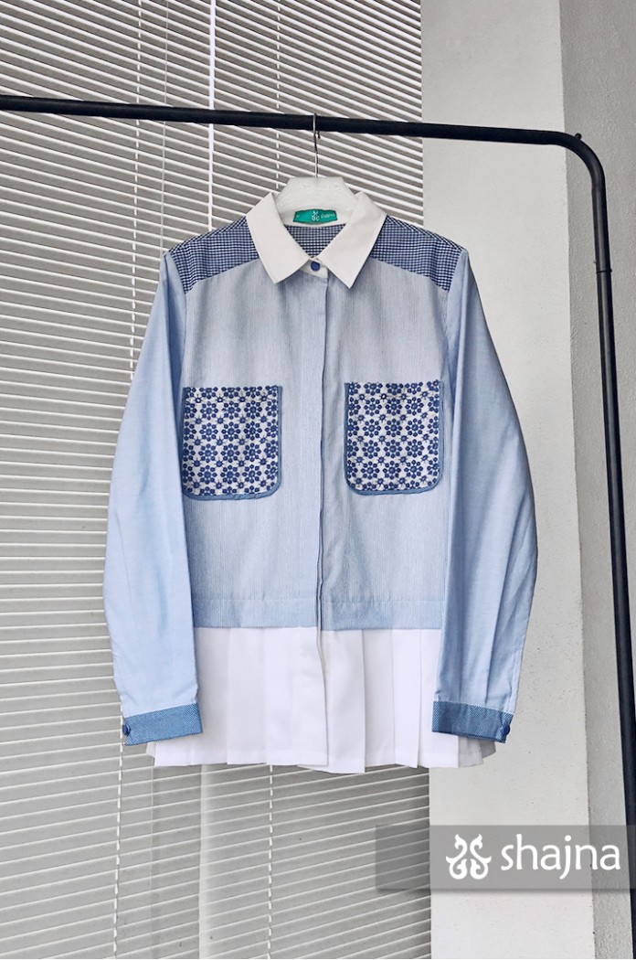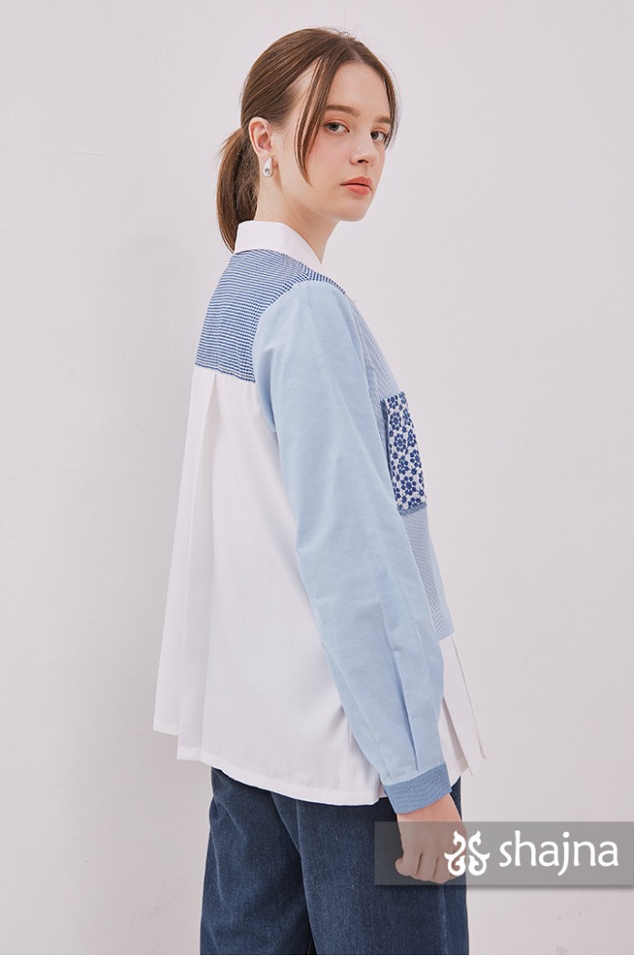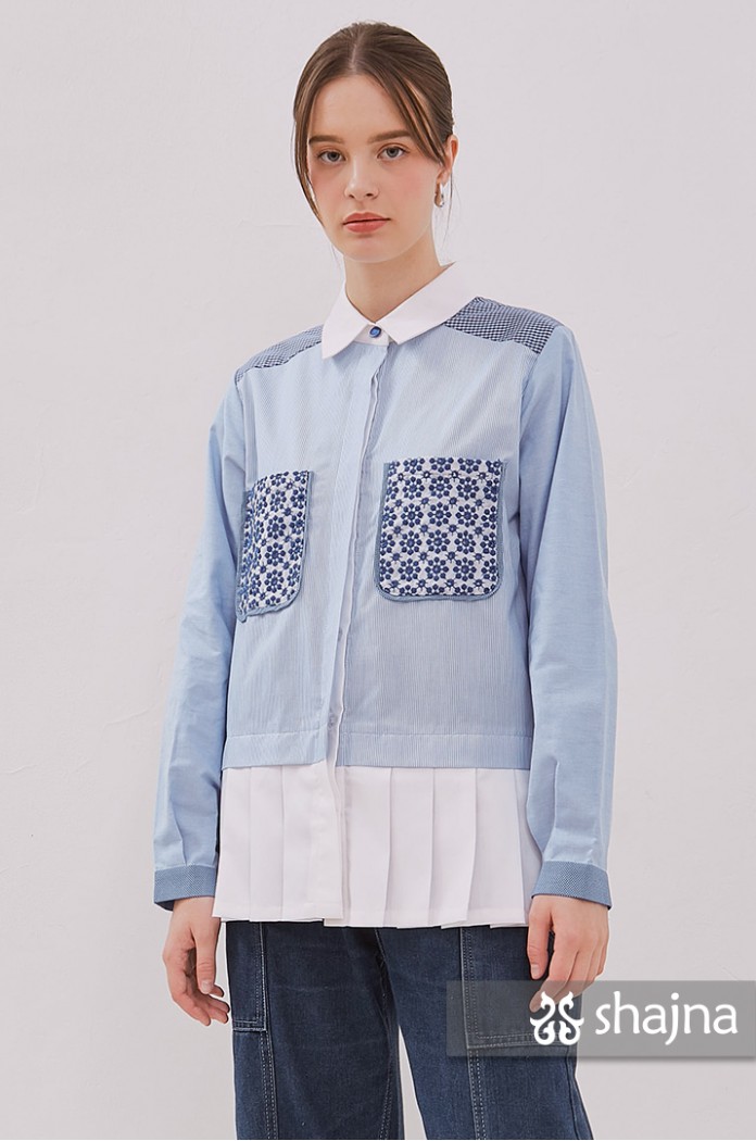 Kemeja mixed pattern dengan detail lipit-lipit dan saku bordir. Bukaan di depan dengan kancing tersembunyi.