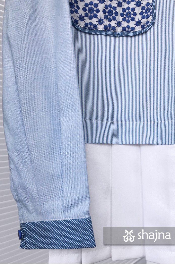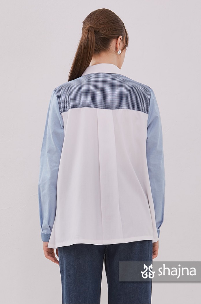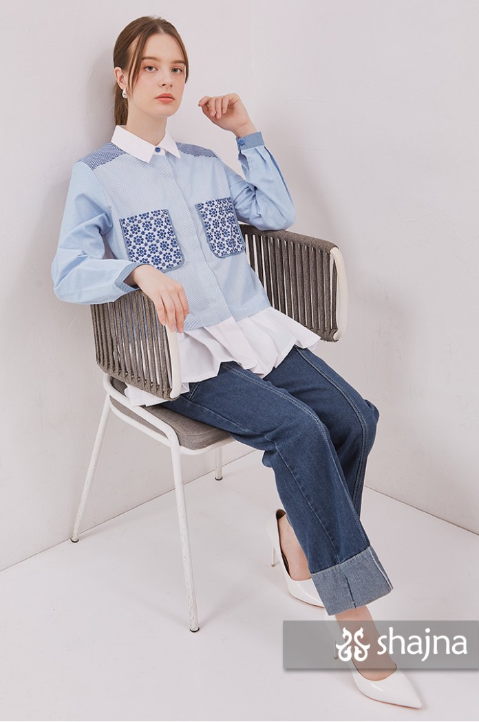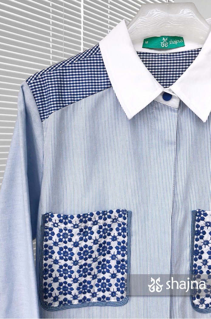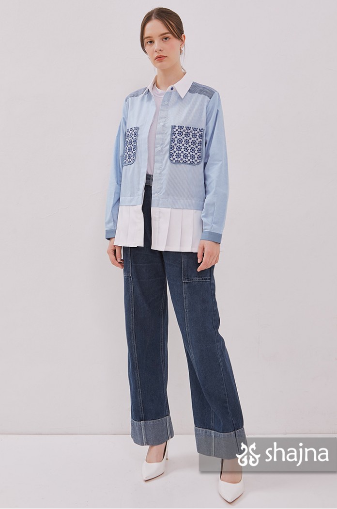 Kemeja mixed pattern dengan detail lipit-lipit dan saku bordir. Bukaan di depan dengan kancing tersembunyi.
