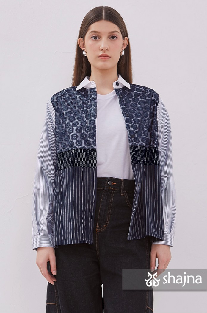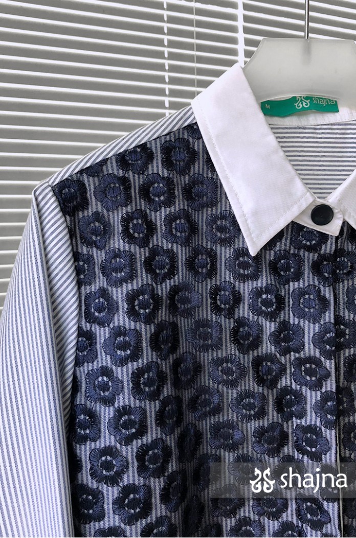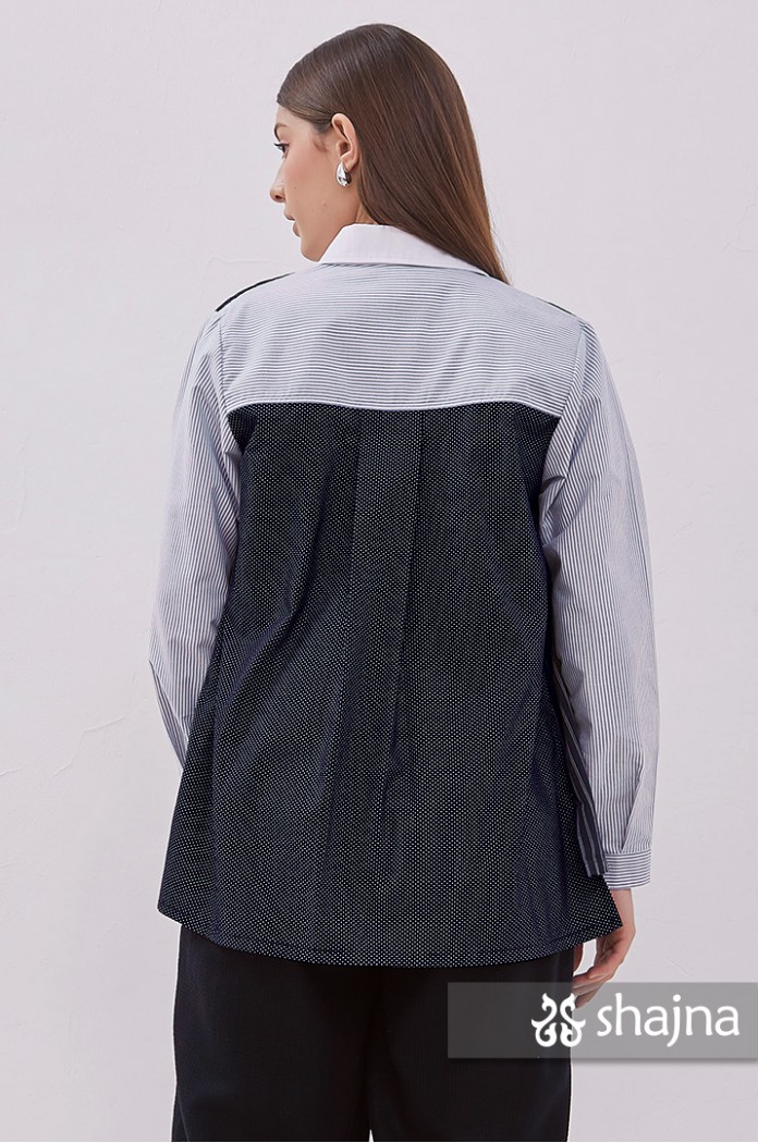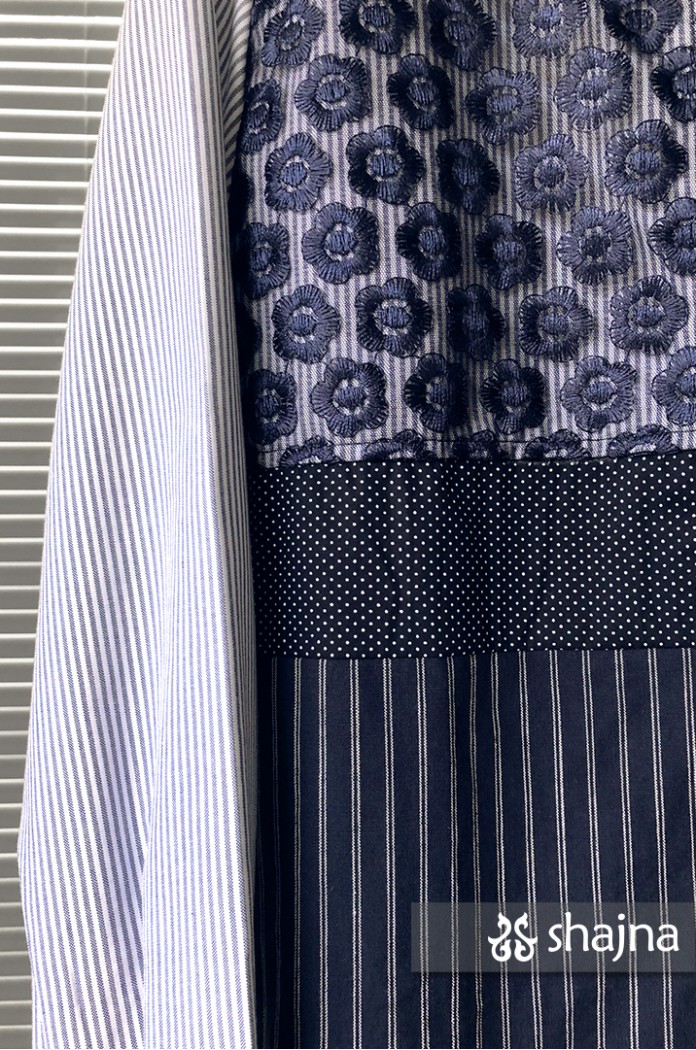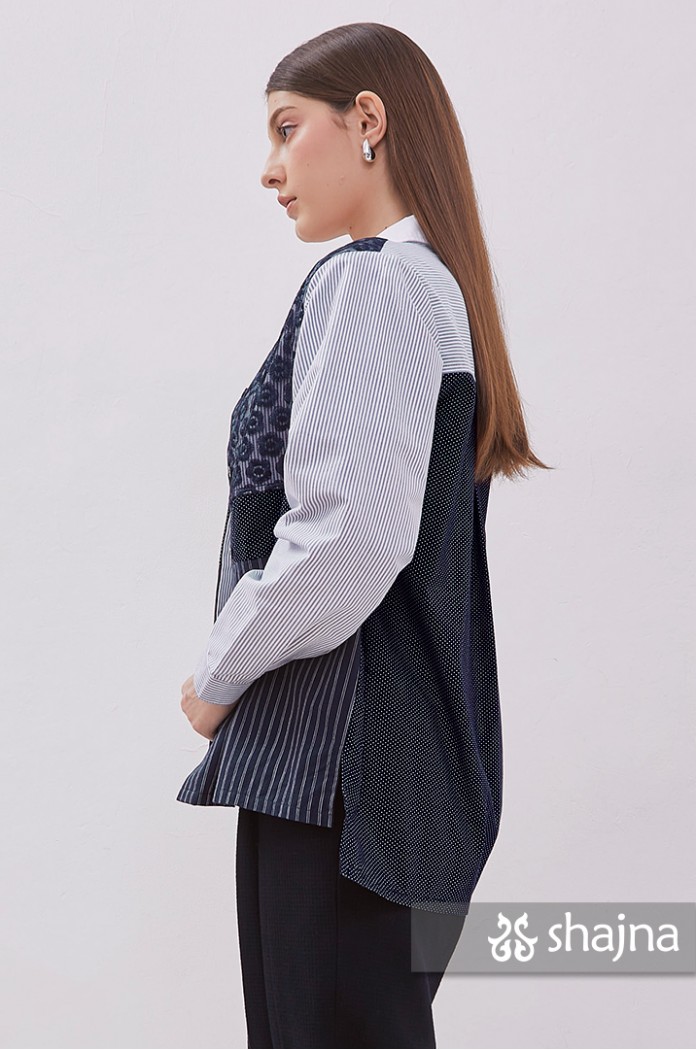 Mixed pattern shirt featuring tulle, embroidery, polka dots, and stripes.