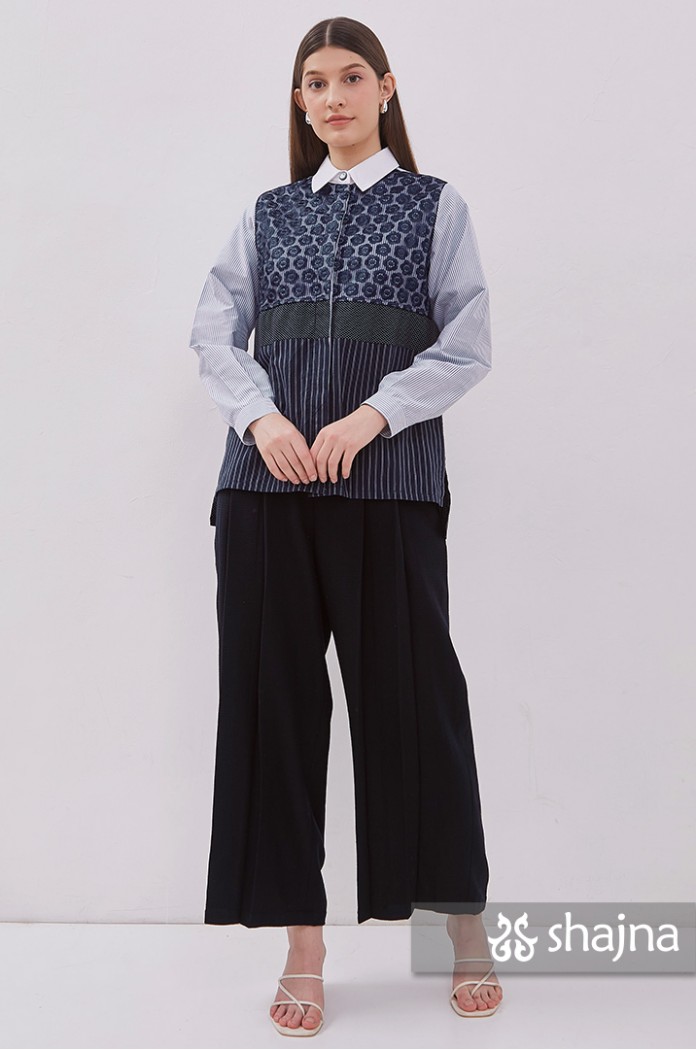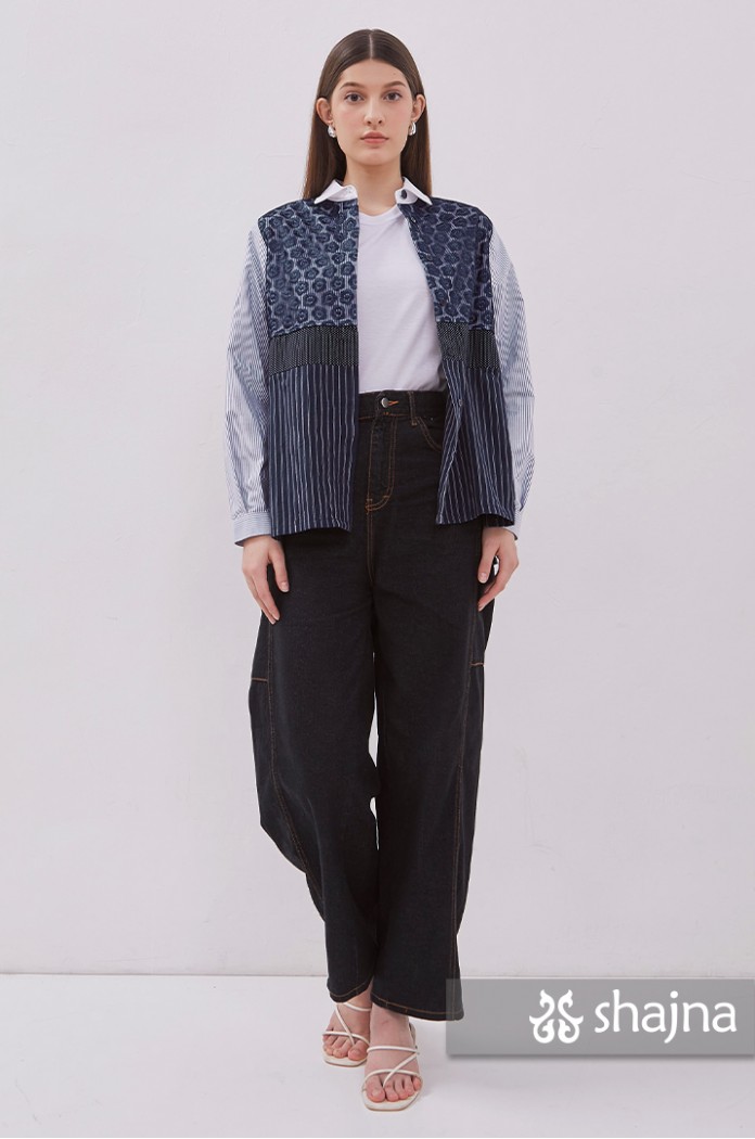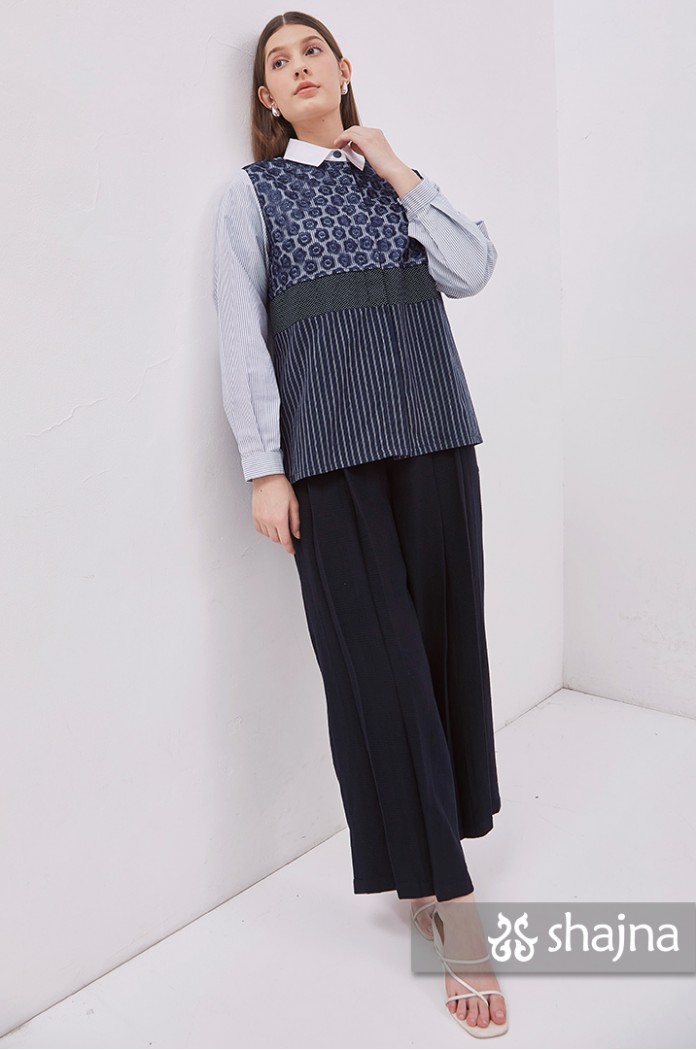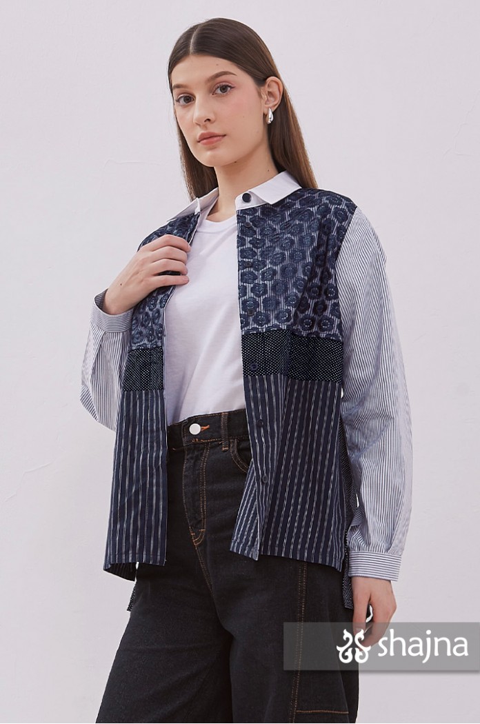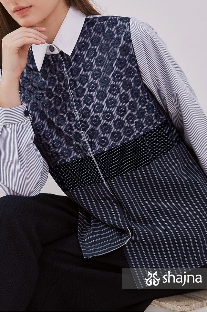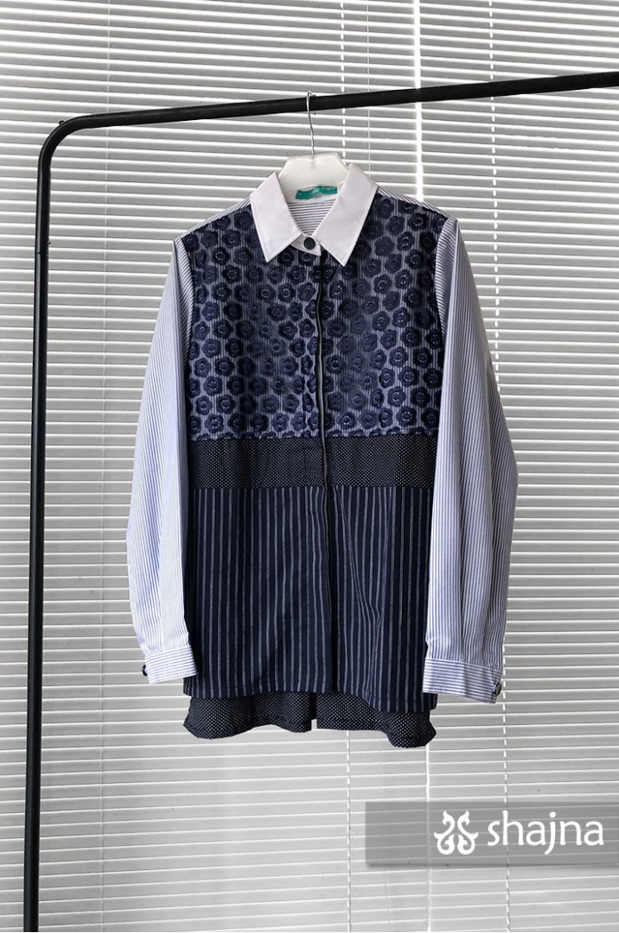 Mixed pattern shirt featuring tulle, embroidery, polka dots, and stripes.